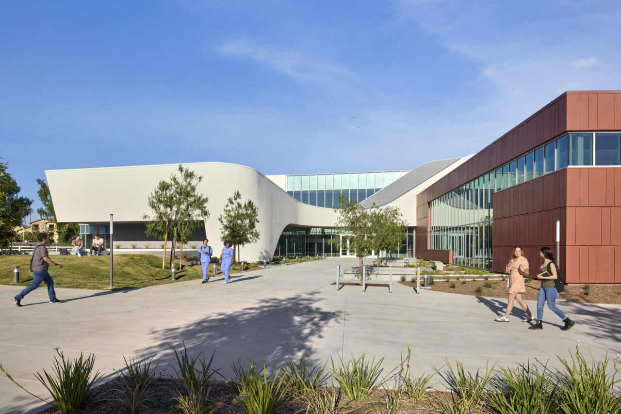 Chaffey College marked the opening of the new instructional building at its Chino, California, campus with a ribbon-cutting ceremony, attended by students, faculty, district officials, local dignitaries and neighbors. The new, HMC-designed building links spaces that connect with nature to provide opportunities to gather, learn, and grow.