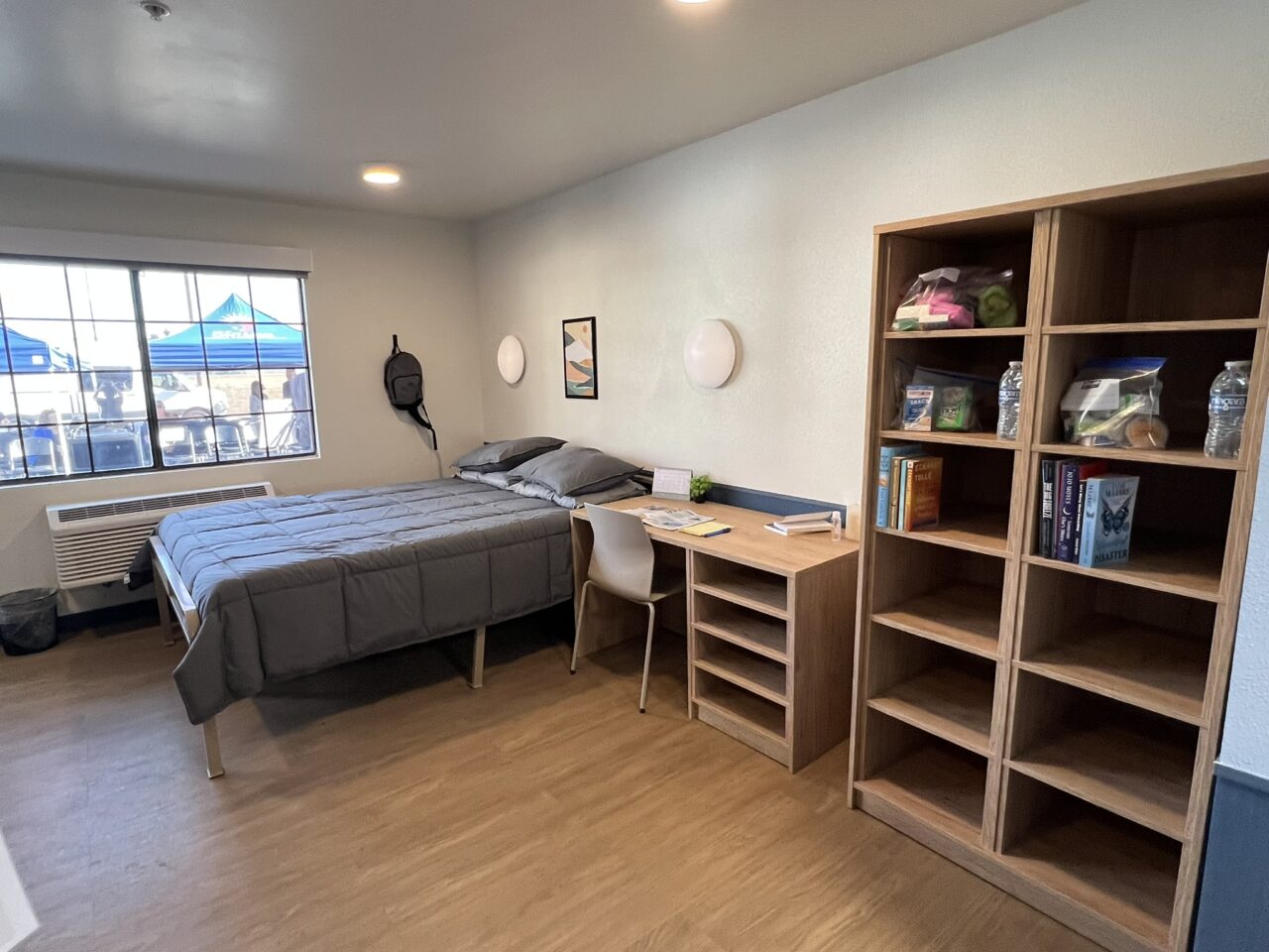 HMC adapted an existing, older hotel building and transformed it into a safe 24-hour shelter. The completed Phase One includes eight emergency beds, 26 transitional rooms for interim housing, and drop-in shower, laundry, and food services.