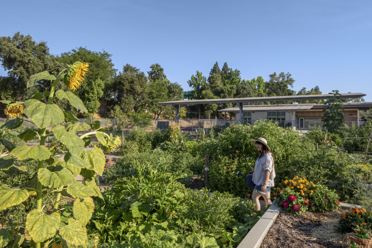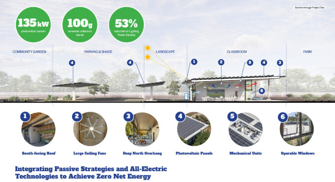 As the first Zero Net Energy building in the Sacramento Unified School District, the design of Floyd Farms prioritized passive strategies. Windows on the south side of the building are protected from the sun, while at the north, full-height windows allow for daylight and a view. Large ceiling fans work in conjunction with operable windows to provide natural ventilation, thereby reducing the need for mechanical heating and cooling. These strategies, paired with a series of south-facing roof and canopy-mounted photovoltaic panels, significantly reduce the operational carbon associated with operating the facility.
