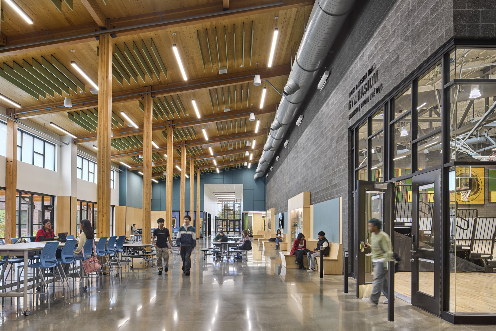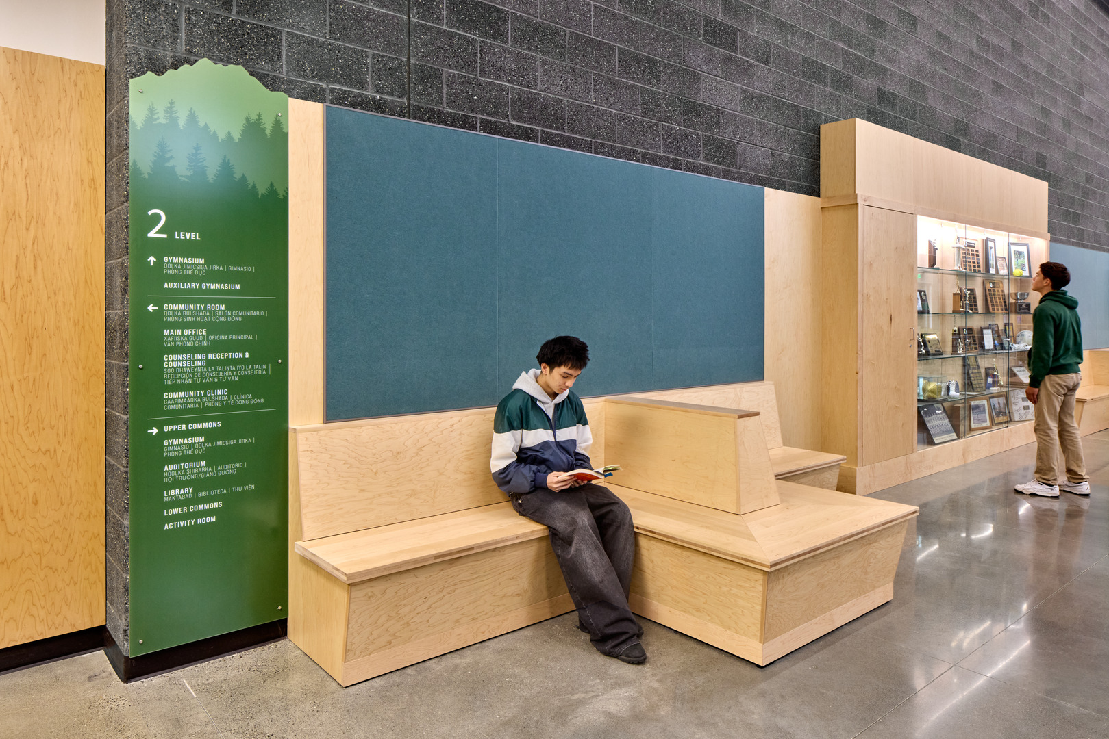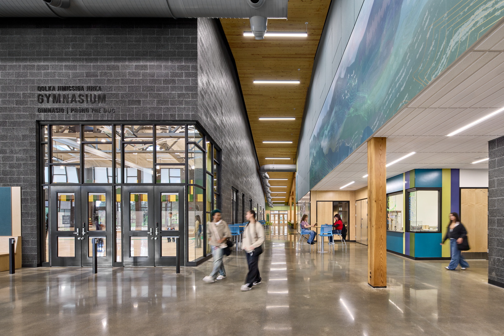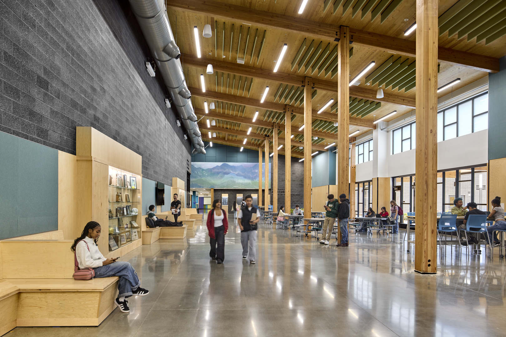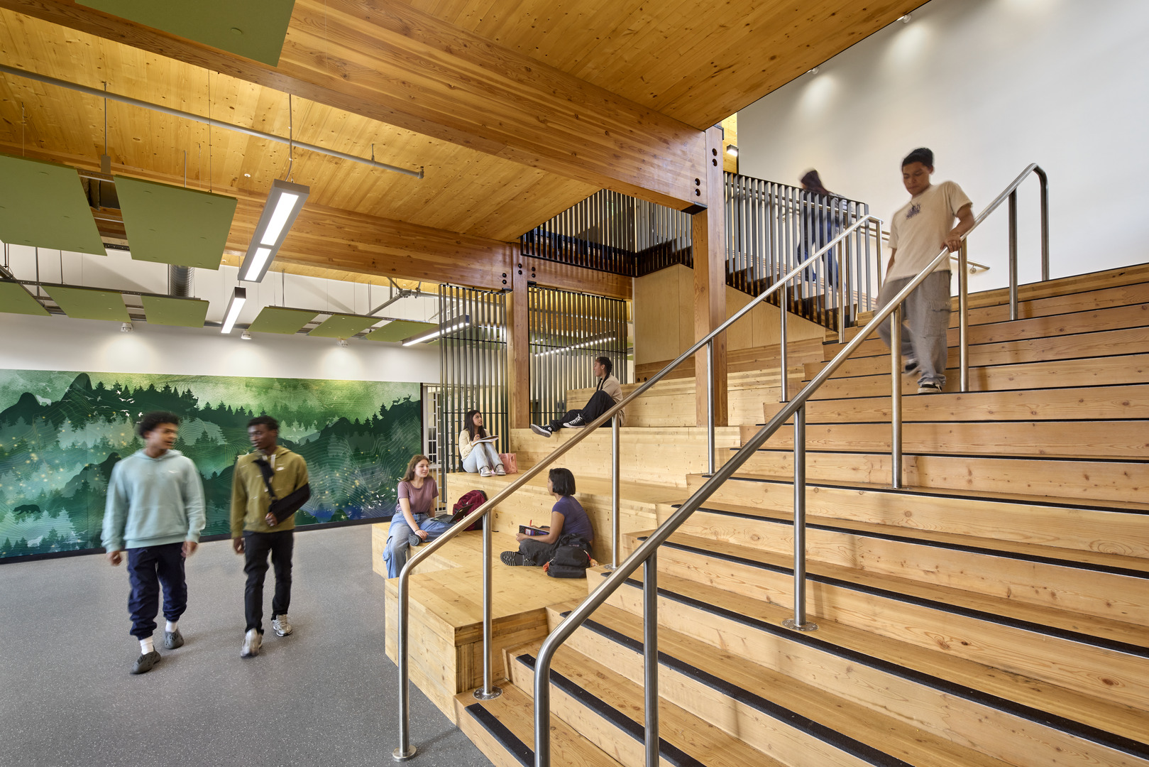 The design responds equally to the lived experiences and aspirations of Evergreen’s students, educators, and families. The school is envisioned as a safe, inclusive, and uplifting environment—one that supports well-being, community connection, and a variety of teaching and learning styles. Welcoming entries provide a sense of shelter and security, while public spaces encourage gathering, collaboration, and engagement. Learning neighborhoods are organized to foster both rigorous instruction and personalized connections between students and adults.
